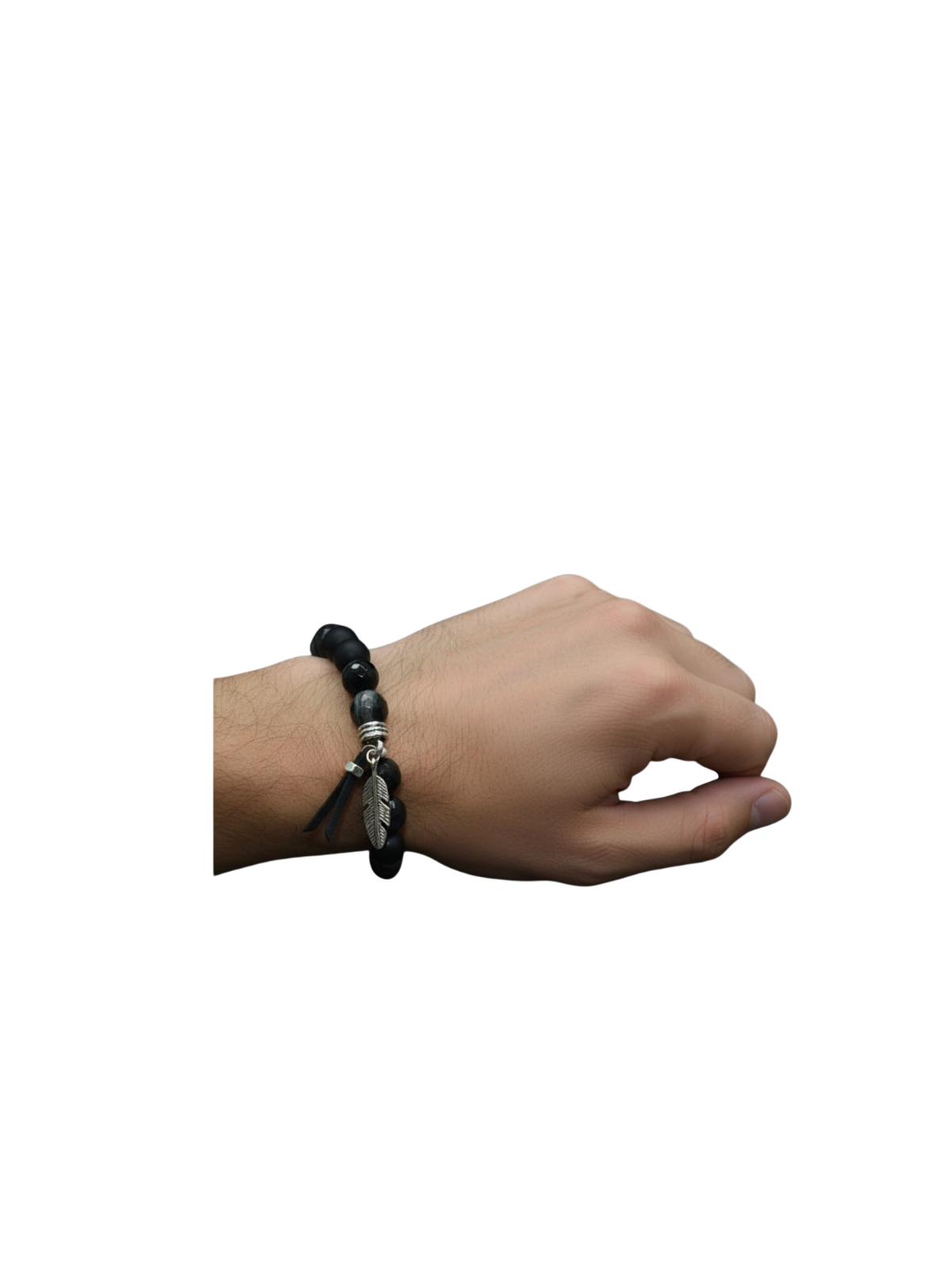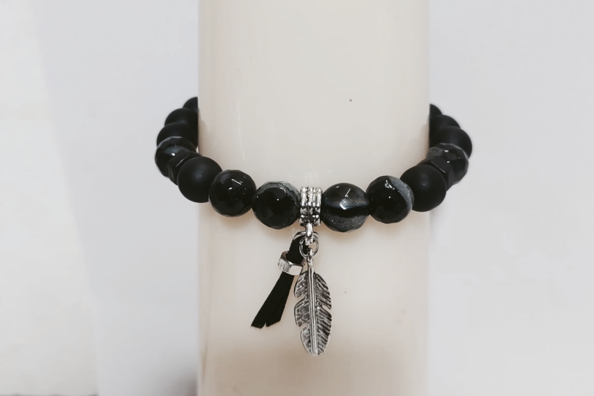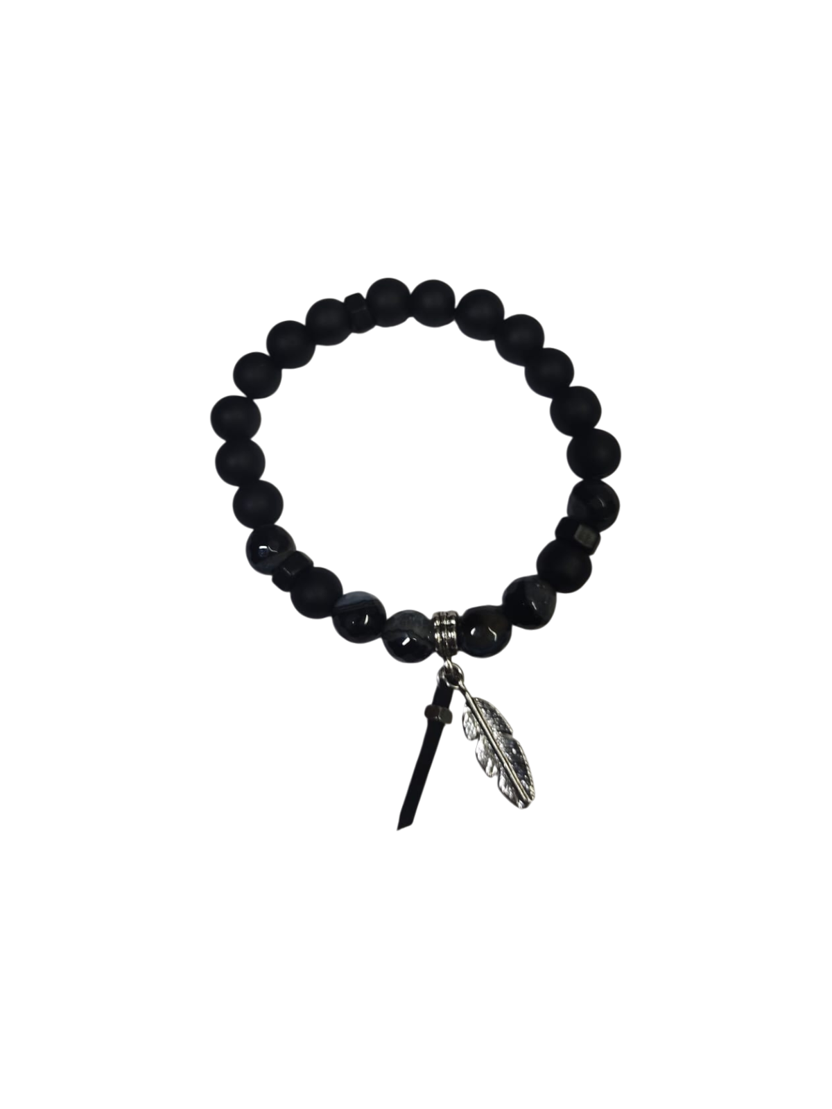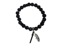 Material type: 10mm Black Onyx diamond cutting Stone with black mate glass beads with feather zinc casting faux leather